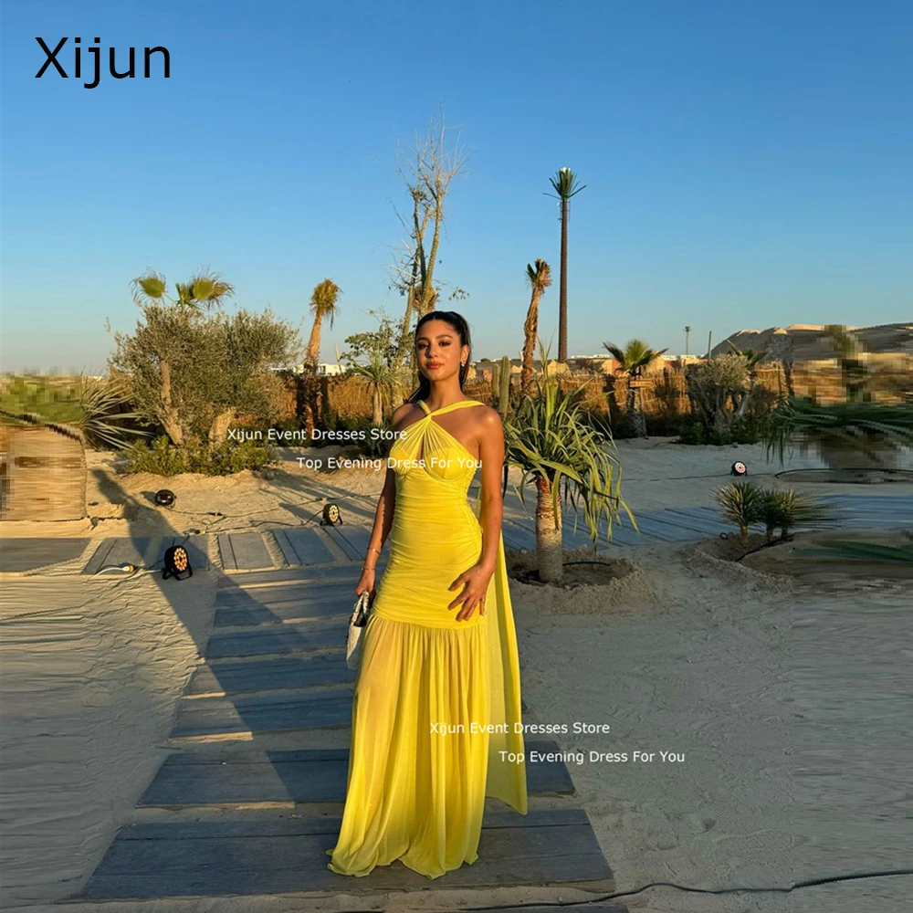 Xijun Baby Yellow Chiffon Evening Dresses Ruched Elegant Prom Dresses Pleated Side Slit Backless Beach Prom Gowns Saudi Arabric